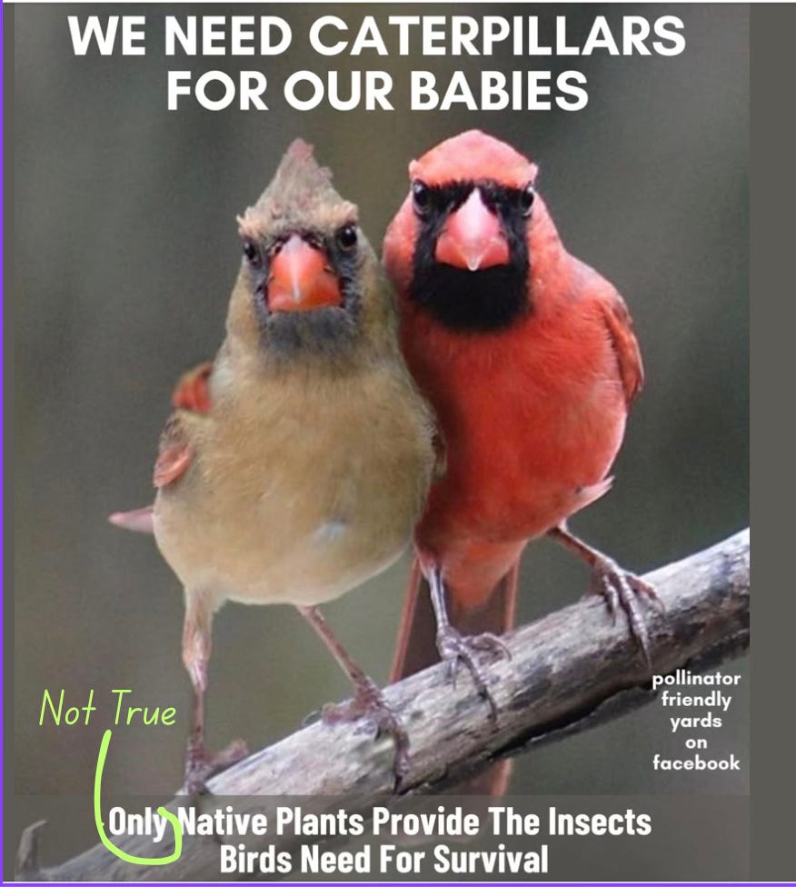 We’ve all seen the memes like in the photo below. Here's the thing: if native insects could only survive on native plants, we wouldn't have Clemson and 65 other ag colleges spending the last century desperately trying to keep grasshoppers from devouring our wheat, oats, and soybean fields. Grasshoppers are native. Wheat isn't. Yet somehow they manage to eat it just fine, without checking its passport first.